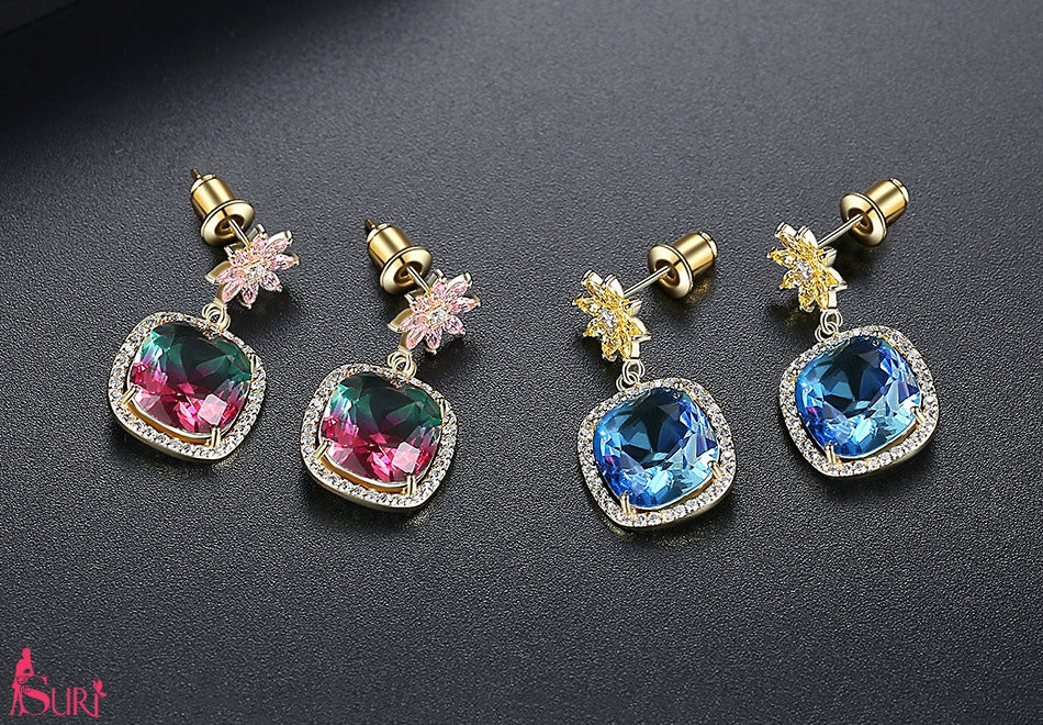 Bông Tai Đá Vuông Xanh Hoa Đá Vàng Nữ Tính