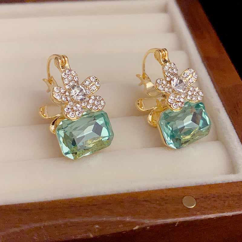 Bông Tai Khoen Đá Chữ Nhật Xanh Phối Hoa Đá 5 Cánh Trắng