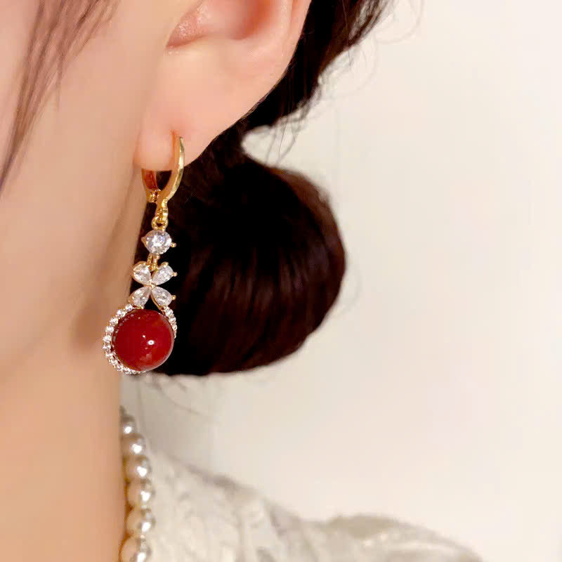 BÔNG TAI KHOEN TÒN TENG 1 HẠT TRAI ĐỎ PHỐI HOA ĐÁ 4 CÁNH VIỀN ĐÁ THỜI TRANG