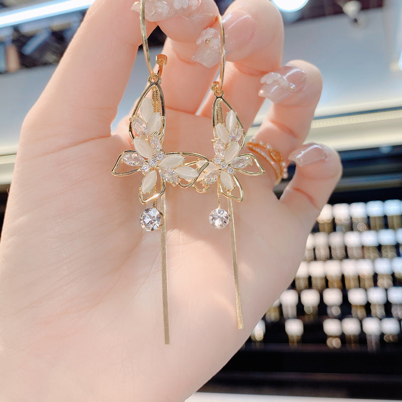 Bông Tai Khoen Tòn Teng Kiểu Dáng Hình Bướm Phối Đá Mắt Mèo Sang Chảnh