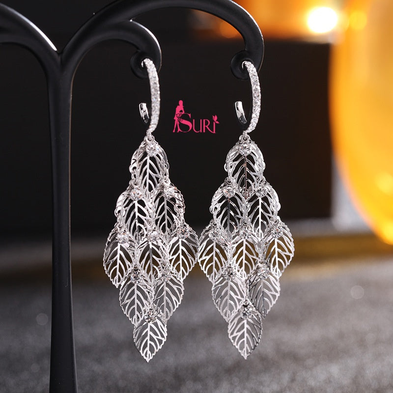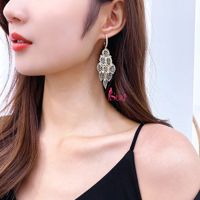 Bông Tai Khoen Tòn Teng Lá Vàng Xếp Tầng Đính Đá Sang Chảnh