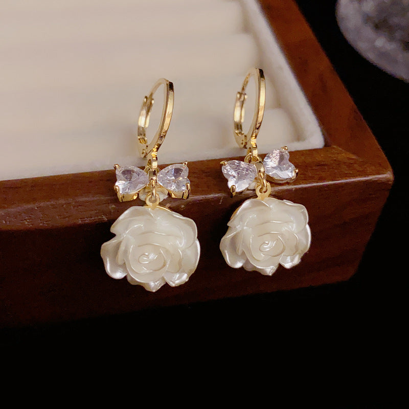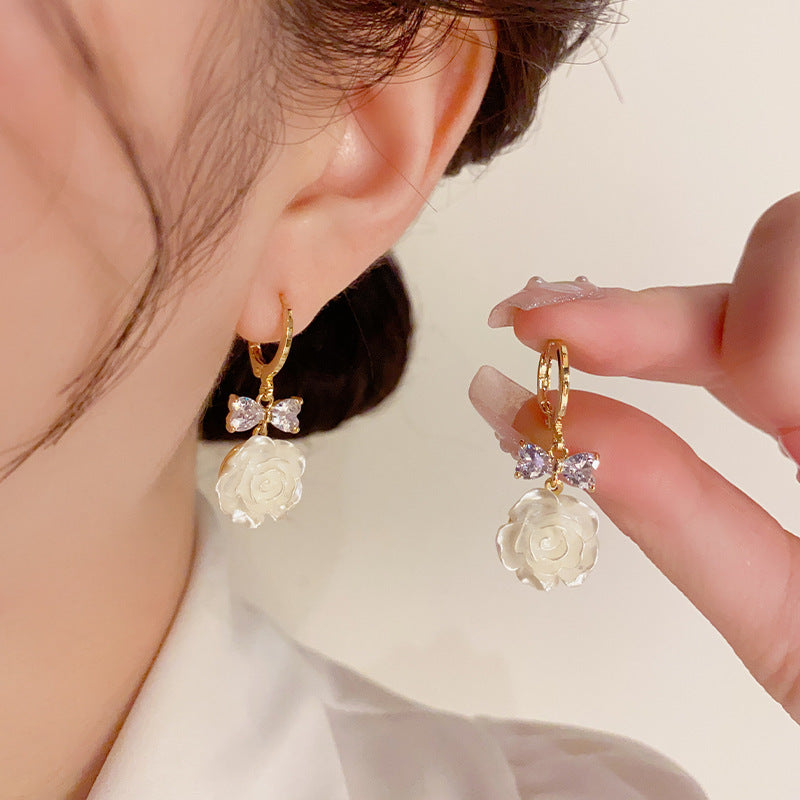 Bông Tai Khoen Tòn Teng Nơ Đá Phối Hoa Hồng Trắng