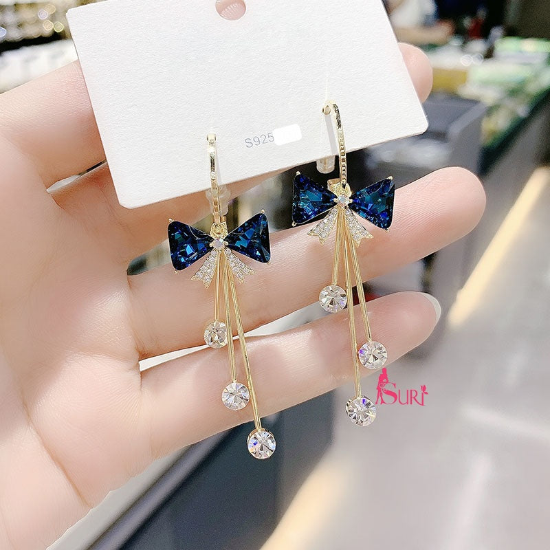 Bông Tai Khoen Tòn Teng Nơ Đá Xanh 3 Hạt Đá Trắng Tua Rua