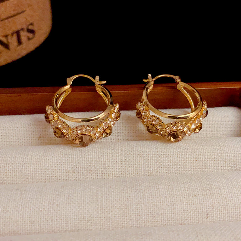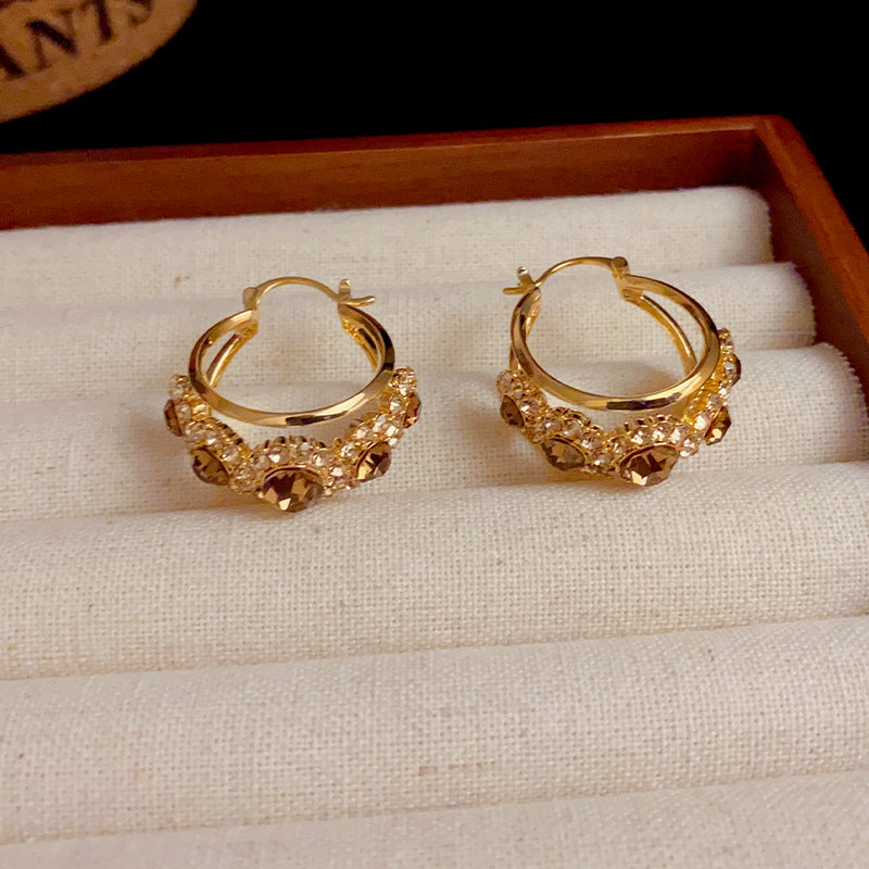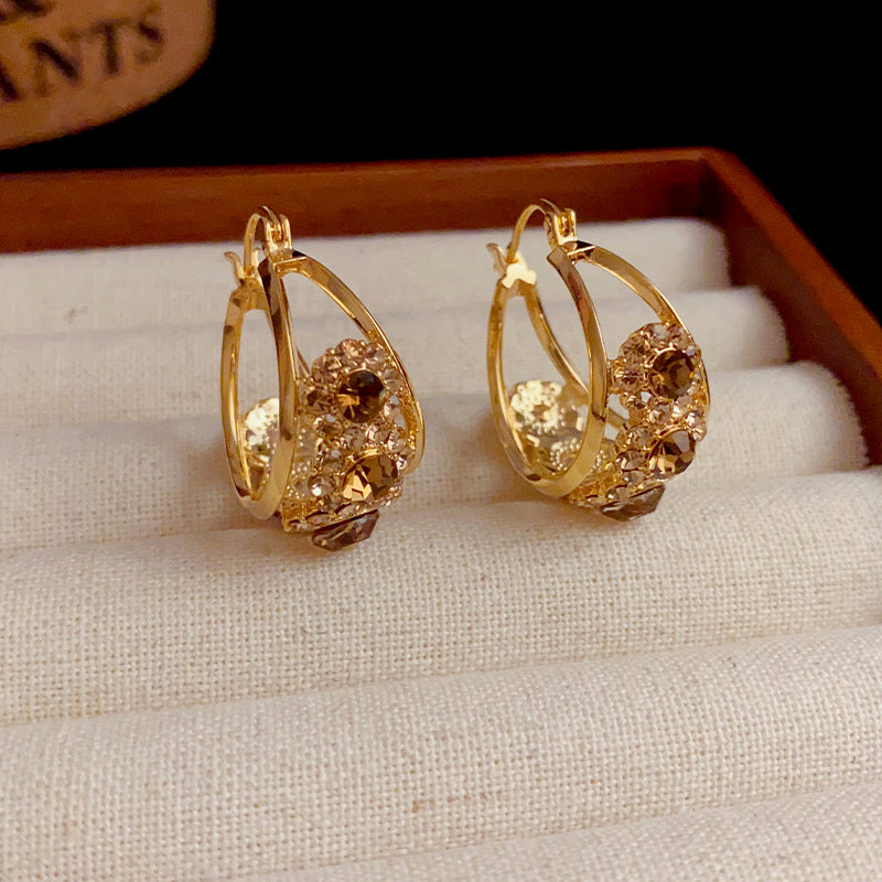 Bông Tai Khoen Tròn Phối Hoa Đá Nâu Trà Lạ Mắt