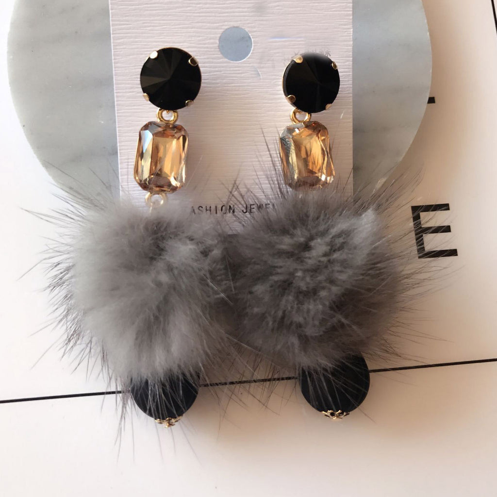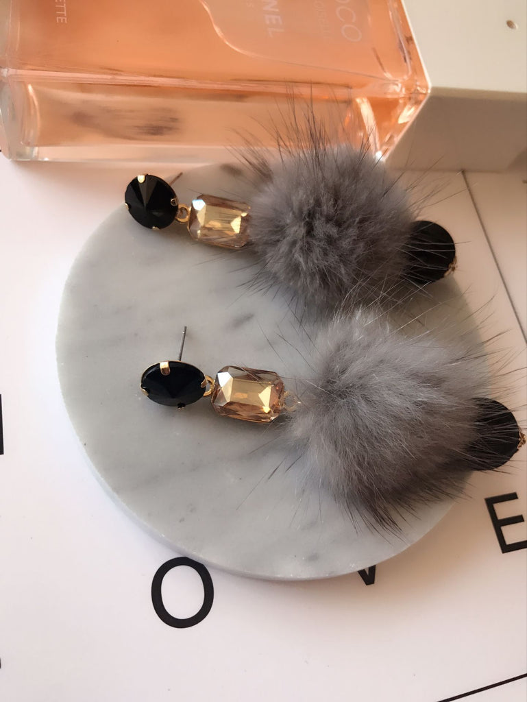 Bông tai lông thú xám đính đá sanh chảnh cao cấp