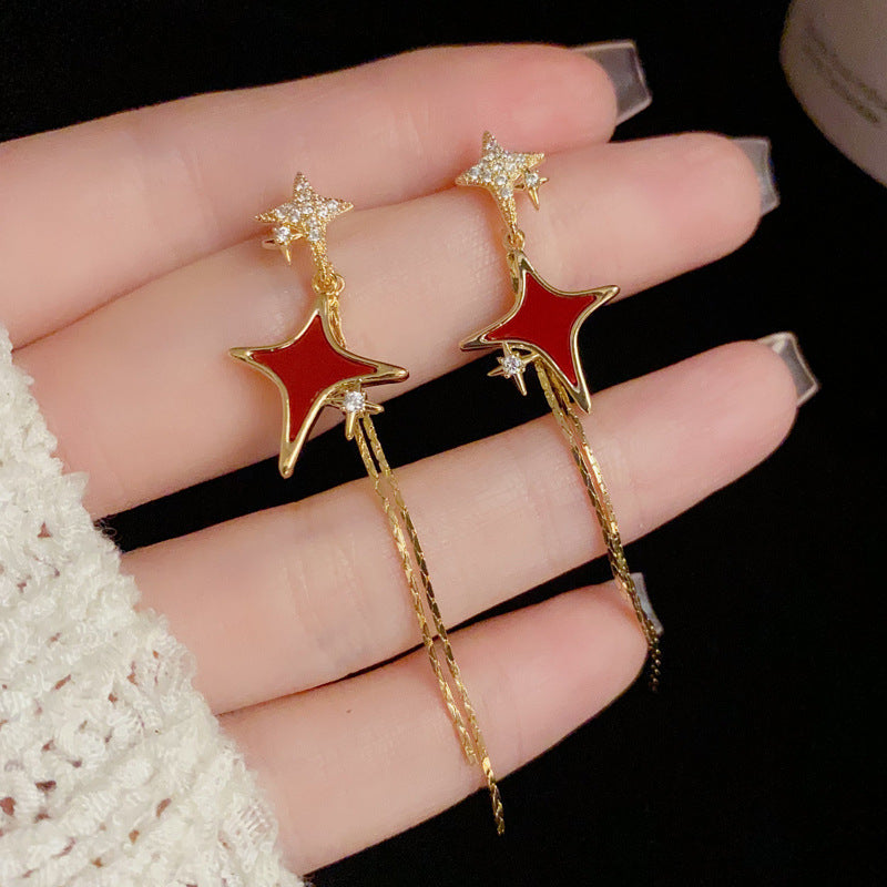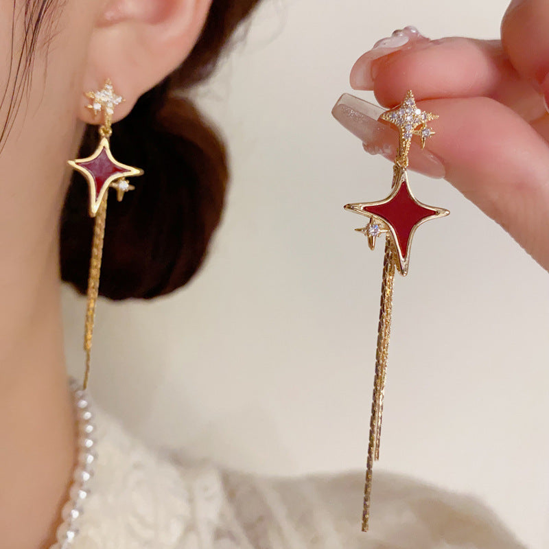 BÔNG TAI SAO BĂNG ĐỎ PHỐI ĐÁ TRẮNG TUA RUA DÁNG DÀI