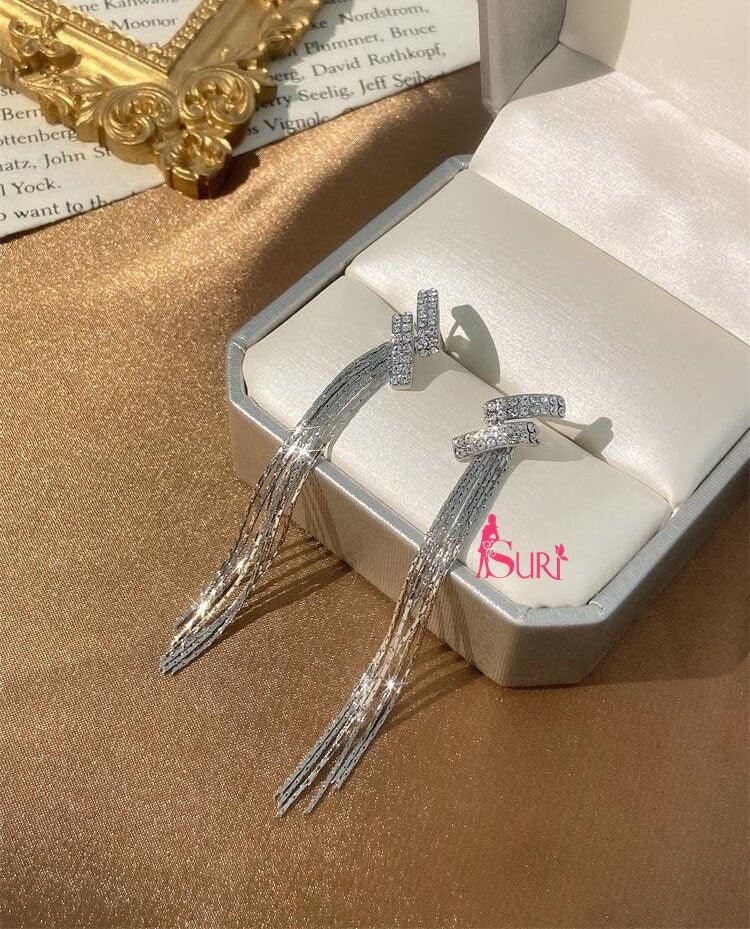 Bông Tai Tòn Teng 2 Hàng Đá Trắng Phối Tua Rua Dáng Dài Sang Chảnh
