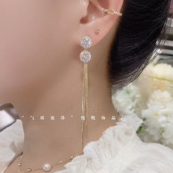Bông Tai Tòn Teng 2 Hạt Đá Trắng Phối Tua Rua Vàng
