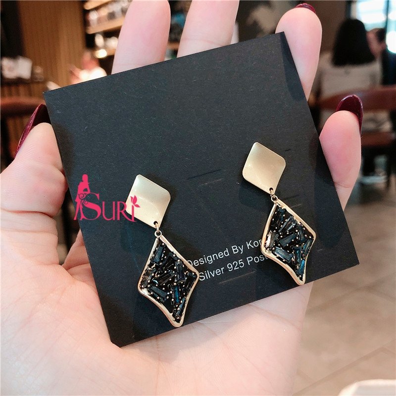 Bông Tai Tòn Teng 2 Hình Thoi Gợn Sóng Đính Đá Đen