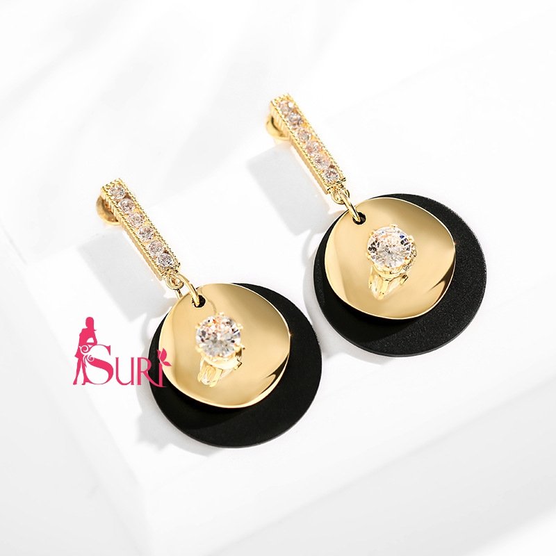 Bông Tai Tòn Teng 2 Hình Tròn Vàng Đen Đính 1 Hạt Đá Trắng