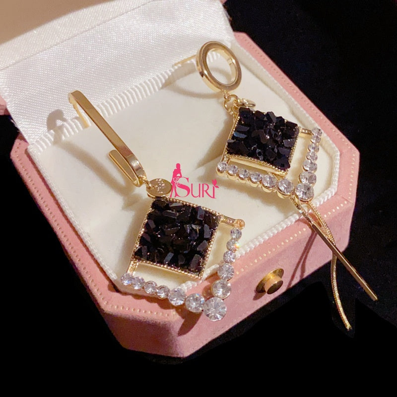 Bông Tai Tòn Teng Bất Đối Xứng Hình Thoi Phối Pha Lê Đen Cá Tính