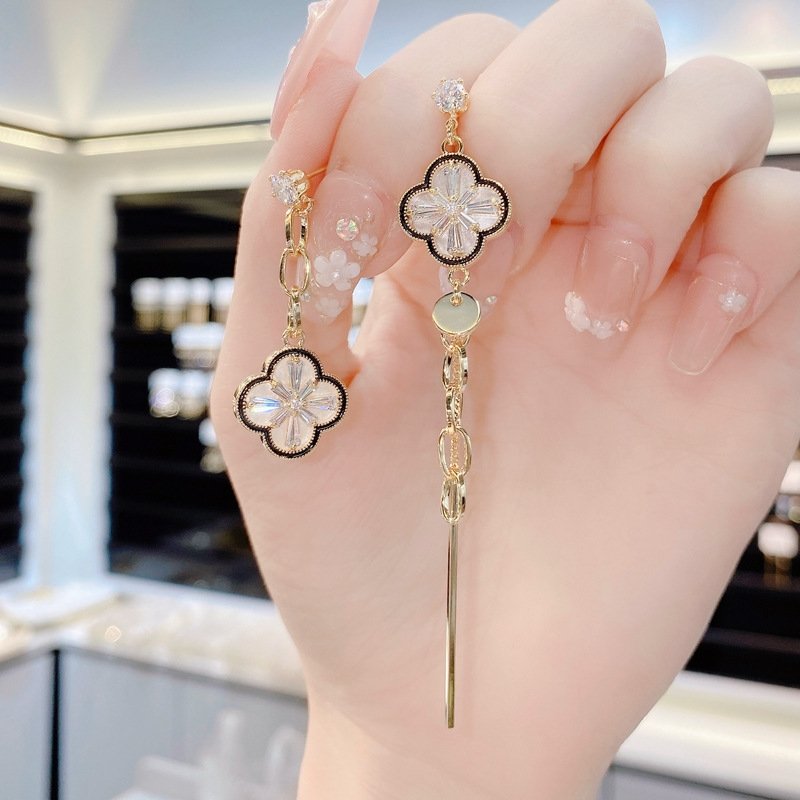 Bông Tai Tòn Teng Bất Đối Xứng Hoa 4 Cánh Bo Tròn Viền Đen Đính Đá Lạ Mắt