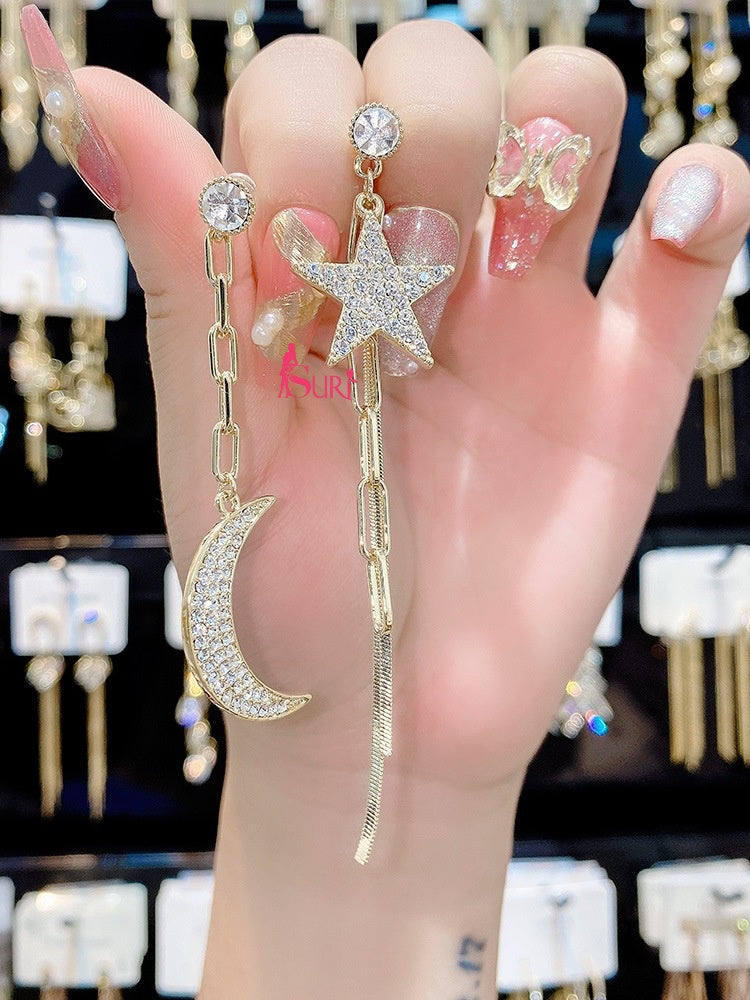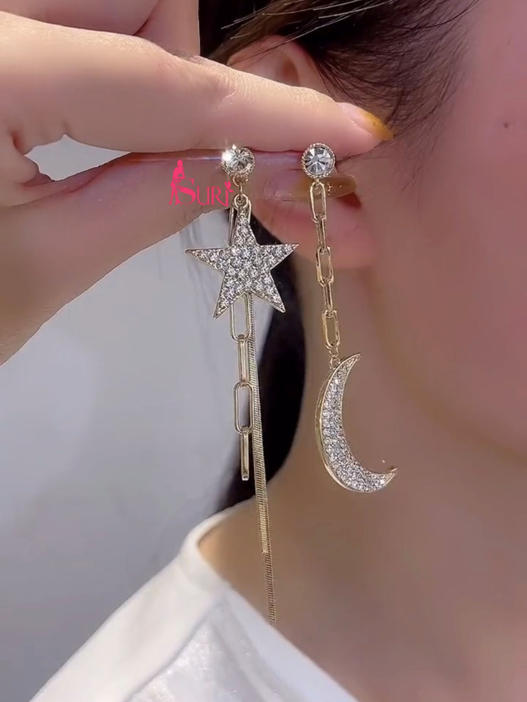 Bông Tai Tòn Teng Bất Đối Xứng Trăng Sao Đính Đá Trắng