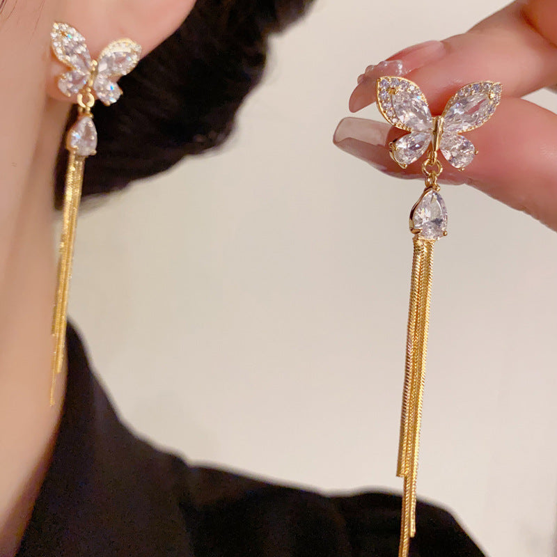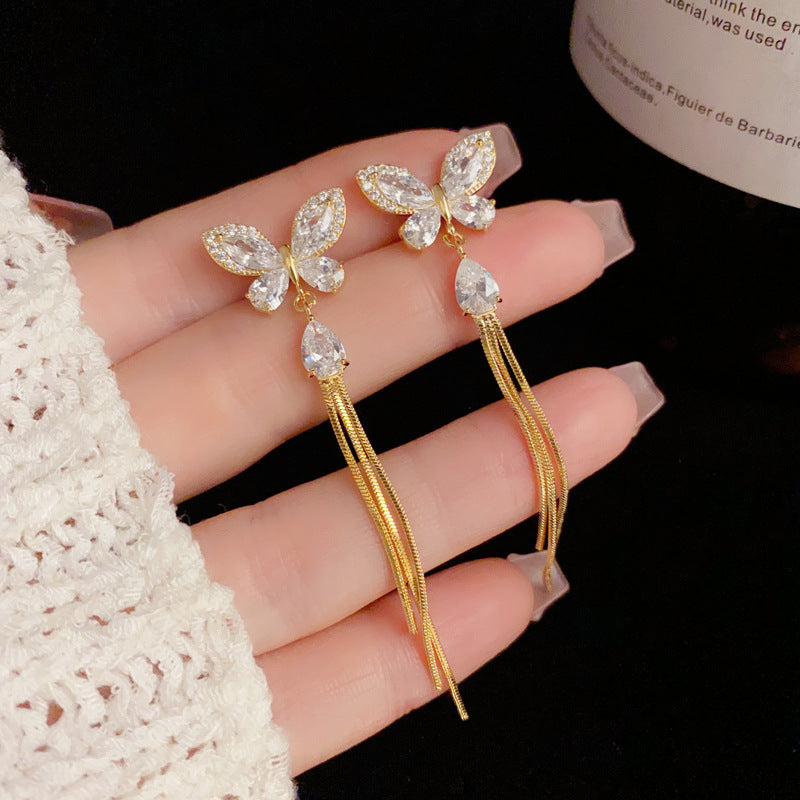 Bông Tai Tòn Teng Cánh Bướm Đính Đá Trắng Tua Rua Siêu Sáng