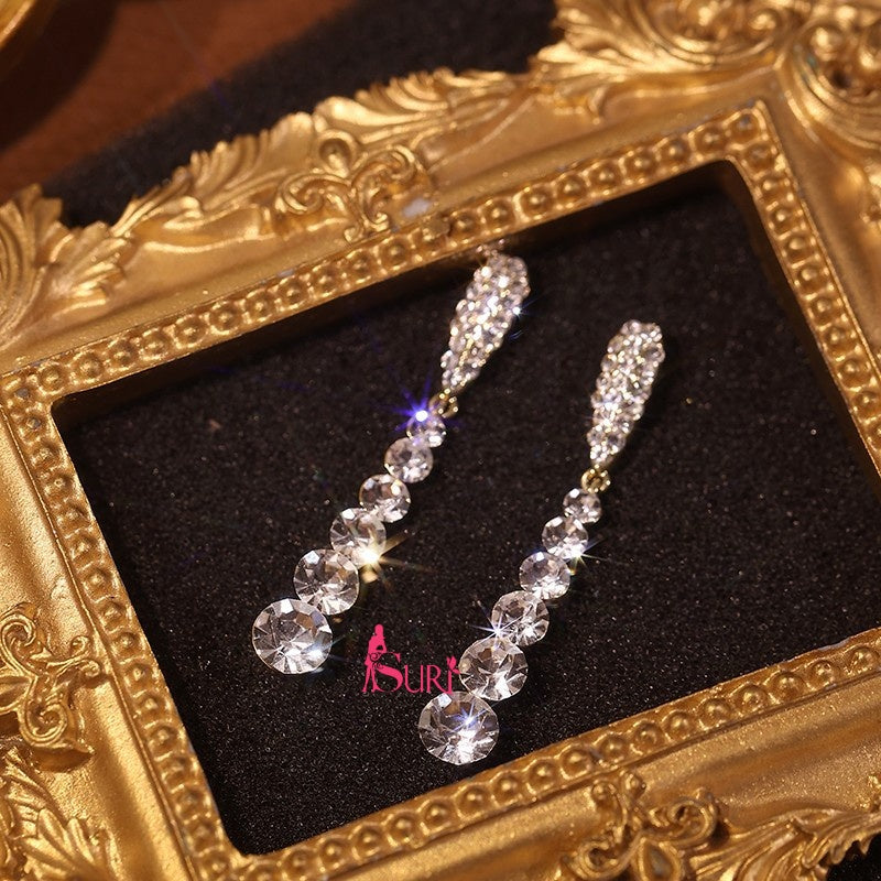 Bông Tai Tòn Teng Đá Tròn Trắng Dáng Dài 6 Hạt Siêu Sáng