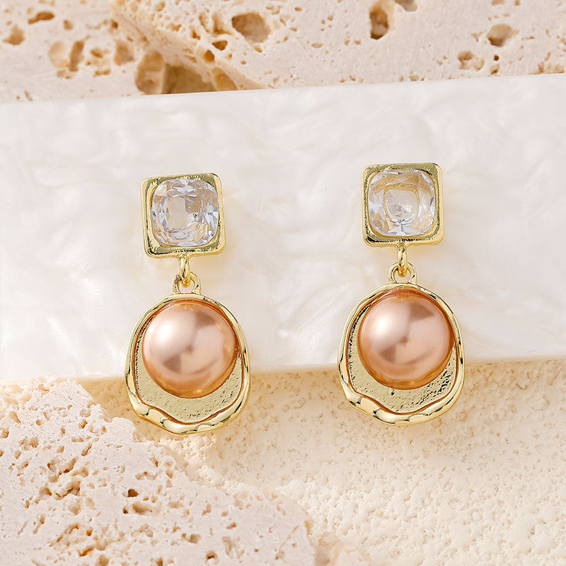 BÔNG TAI TÒN TENG ĐÁ VUÔNG TRẮNG PHỐI HẠT NÂU VIỀN VÀNG