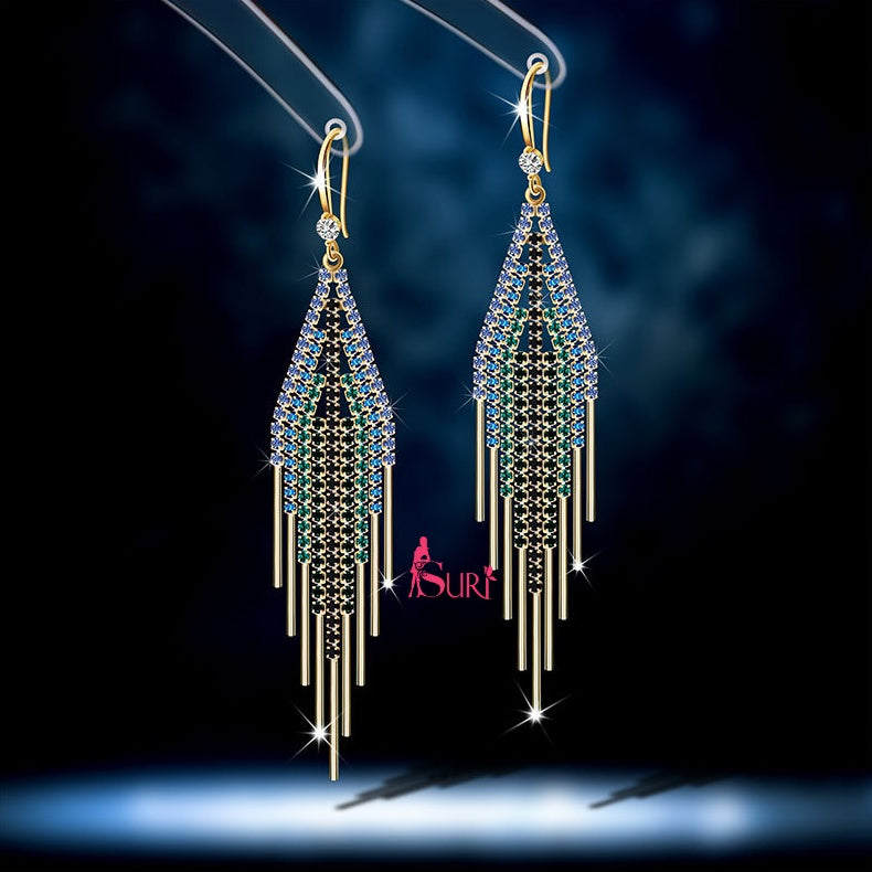 Bông Tai Tòn Teng Dáng Hình Thoi Tua Rua Đá Nhiều Màu Dạng Móc
