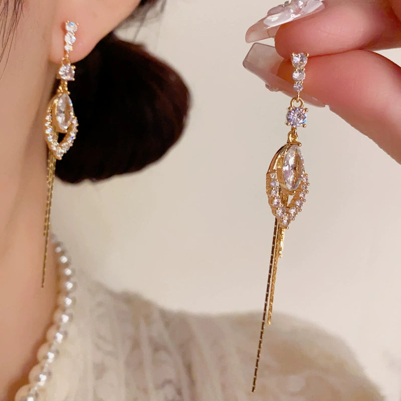 BÔNG TAI TÒN TENG DÁNG LÁ KÉP ĐÍNH ĐÁ TRẮNG TUA RUA DÀI