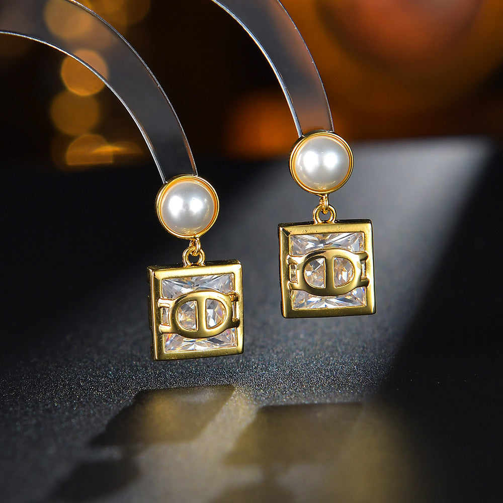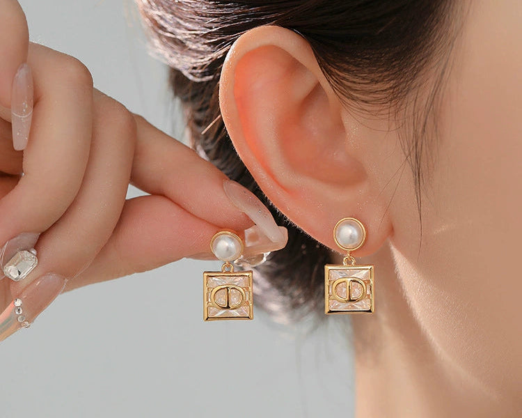 BÔNG TAI TÒN TENG HẠT TRAI PHỐI VUÔNG ĐÁ TRẮNG CHỮ CD