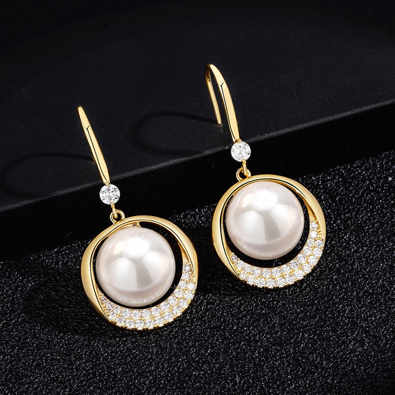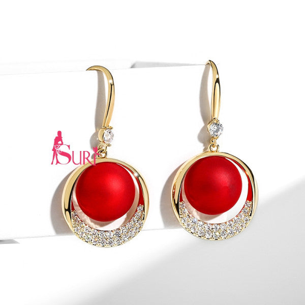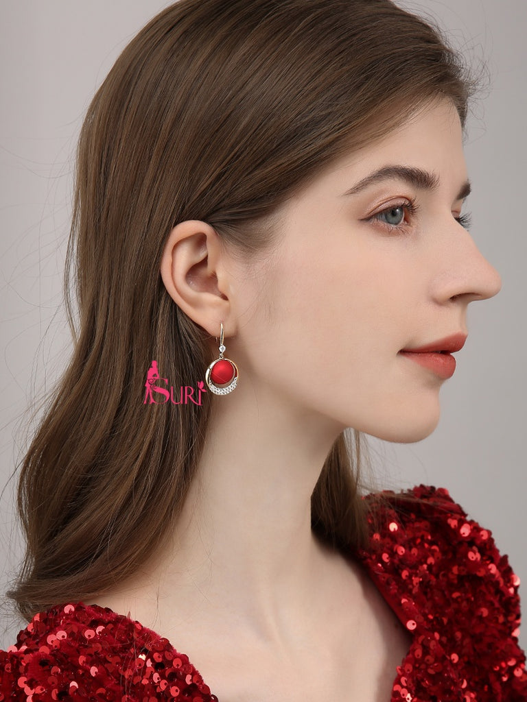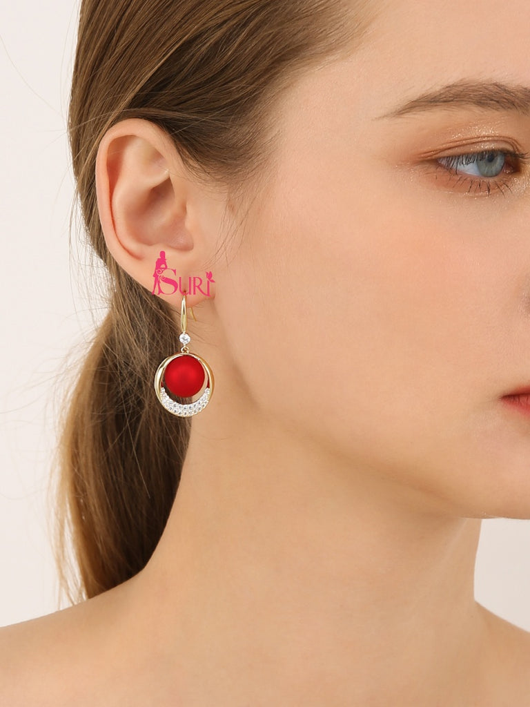 Bông Tai Tòn Teng Hạt Châu Đỏ Nhám Đính Đá Dạng Móc