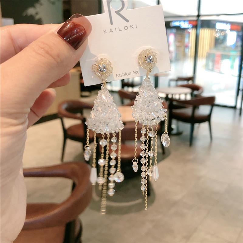 Bông Tai Tòn Teng Hình Chóp Pha Lê Tua Rua Trắng