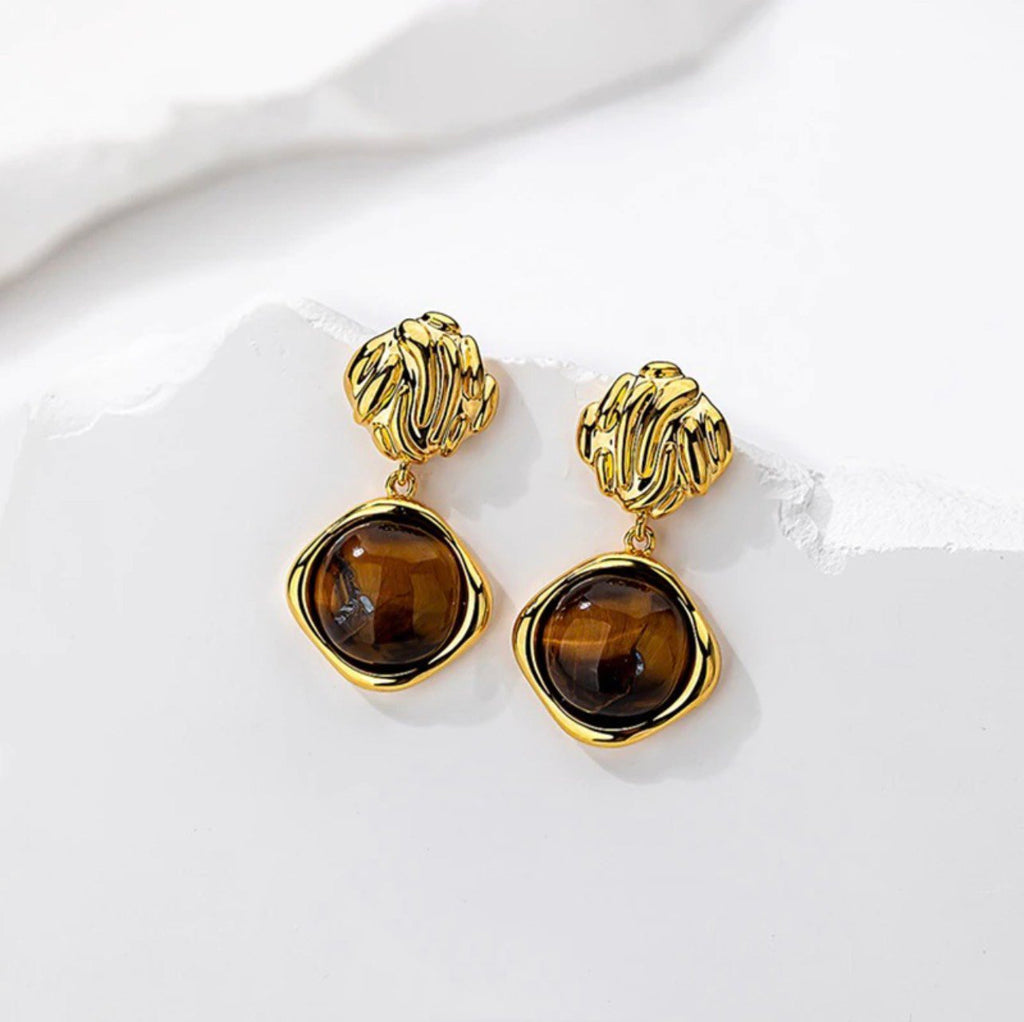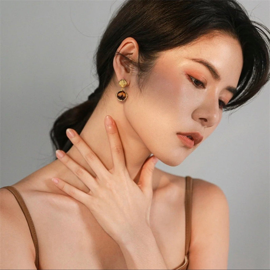 Bông Tai Tòn Teng Hình Học Đá Mắt Mèo Nâu Trầm Thời Trang
