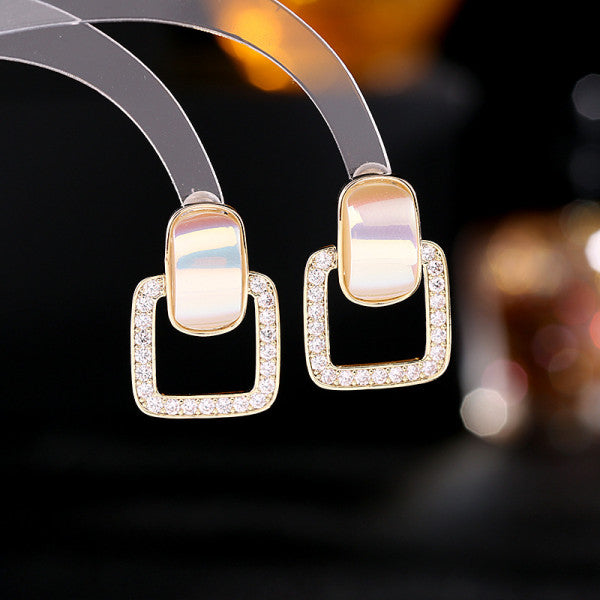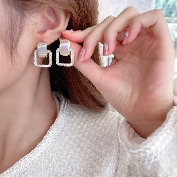 Bông Tai Tòn Teng Hình Học Vuông Đính Đá Ánh Xà Cừ Siêu Xinh