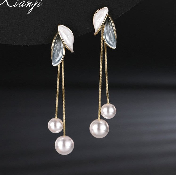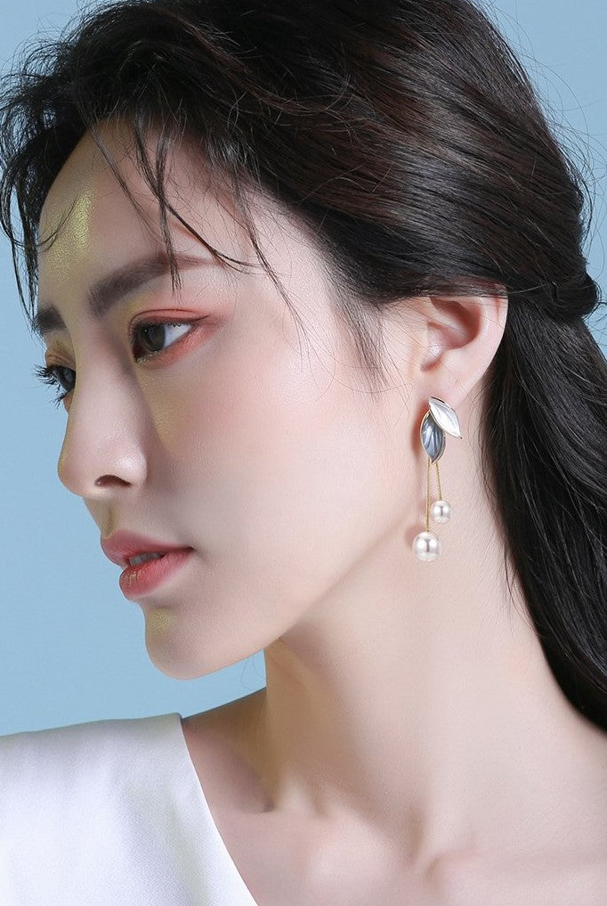 Bông Tai Tòn Teng Hình Lá 2 Màu Trắng Xanh Tua Rua 2 Sợi Ngọc Trai
