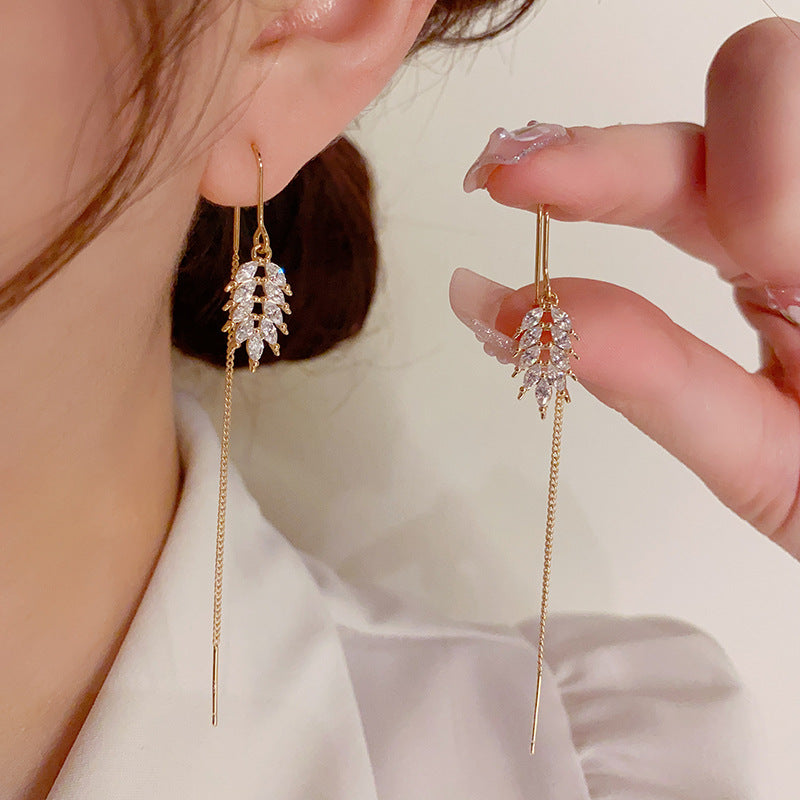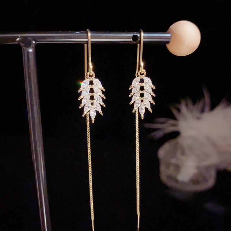 Bông Tai Tòn Teng Hình Lá Đính Đá Trắng Dáng Dài