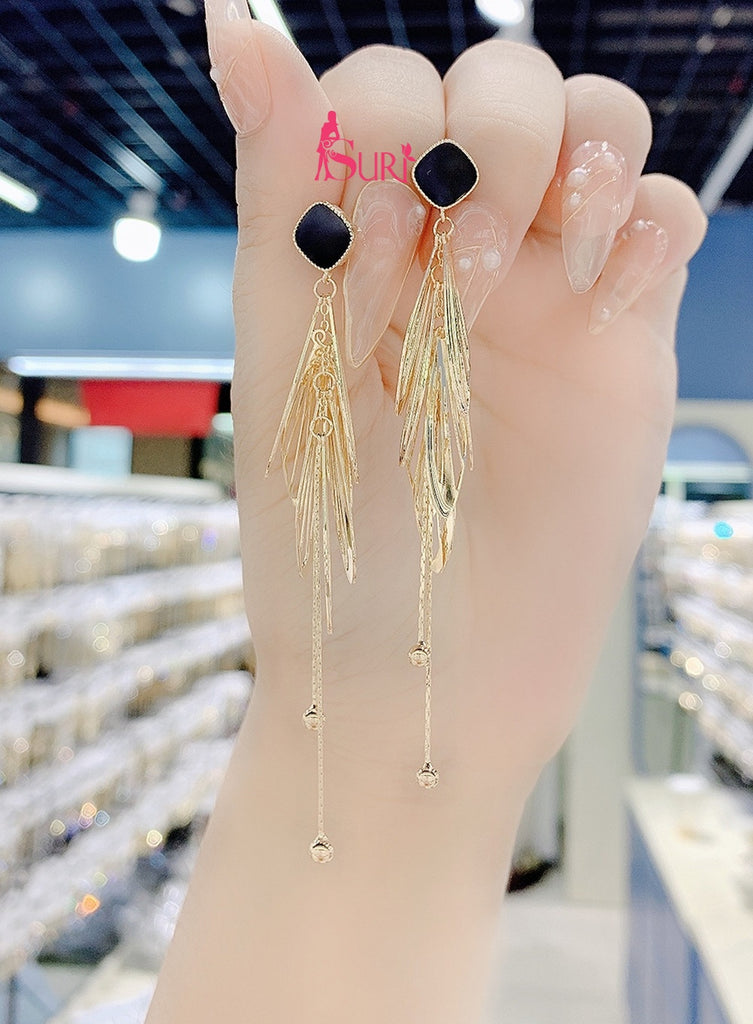 Bông Tai Tòn Teng Hình Thoi Đen Phối Lá Vàng Dáng Dài