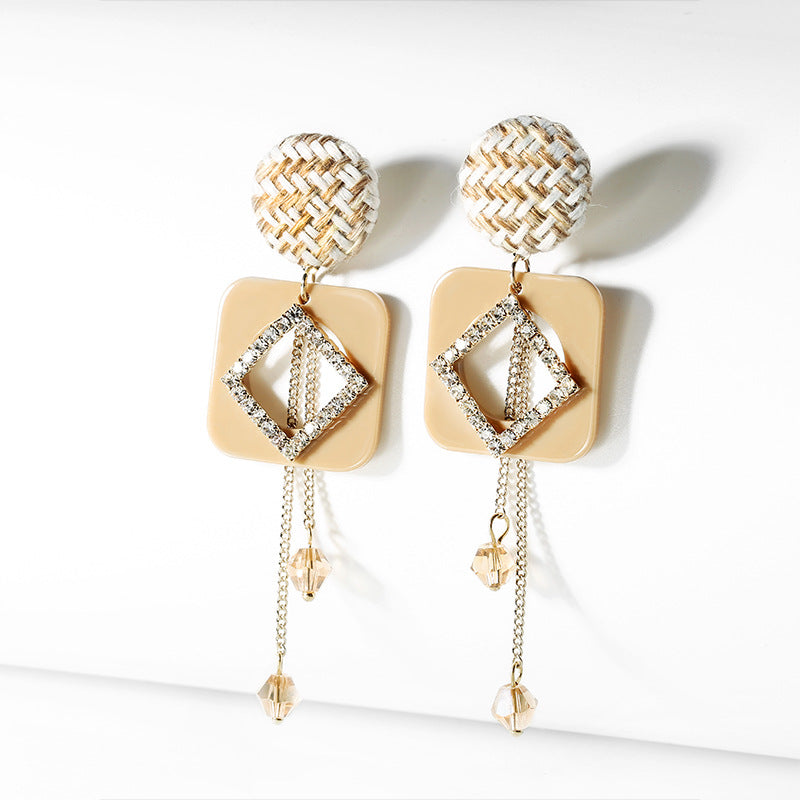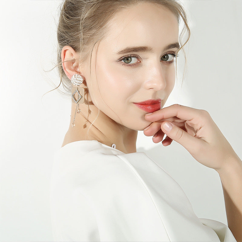Bông Tai Tòn Teng Hình Thoi Màu Kem Đính Đá