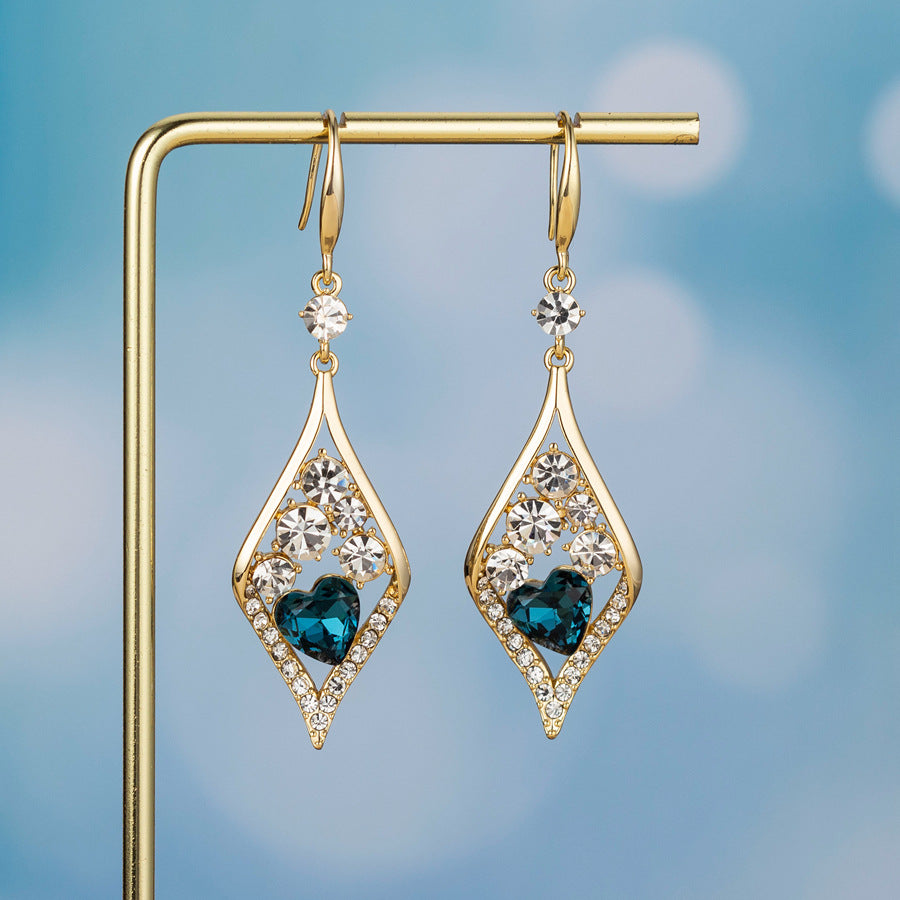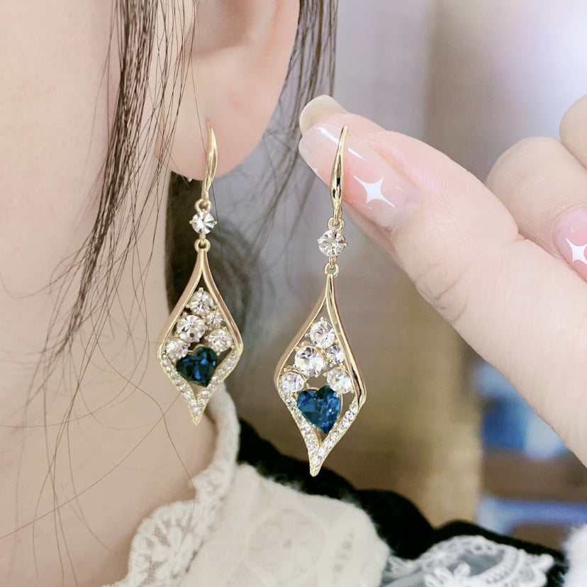 Bông Tai Tòn Teng Hình Thoi Phối Đá Trái Tim Xanh Coban Dạng Móc