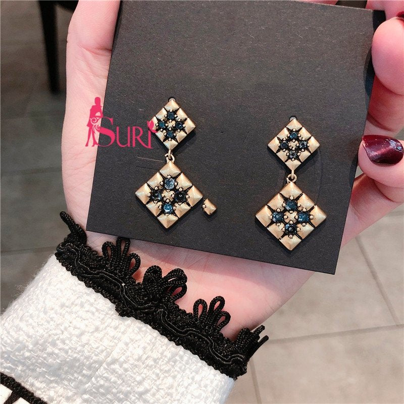 Bông Tai Tòn Teng Hình Thoi Vàng Nhám Đính 4 Hạt Đá Đen