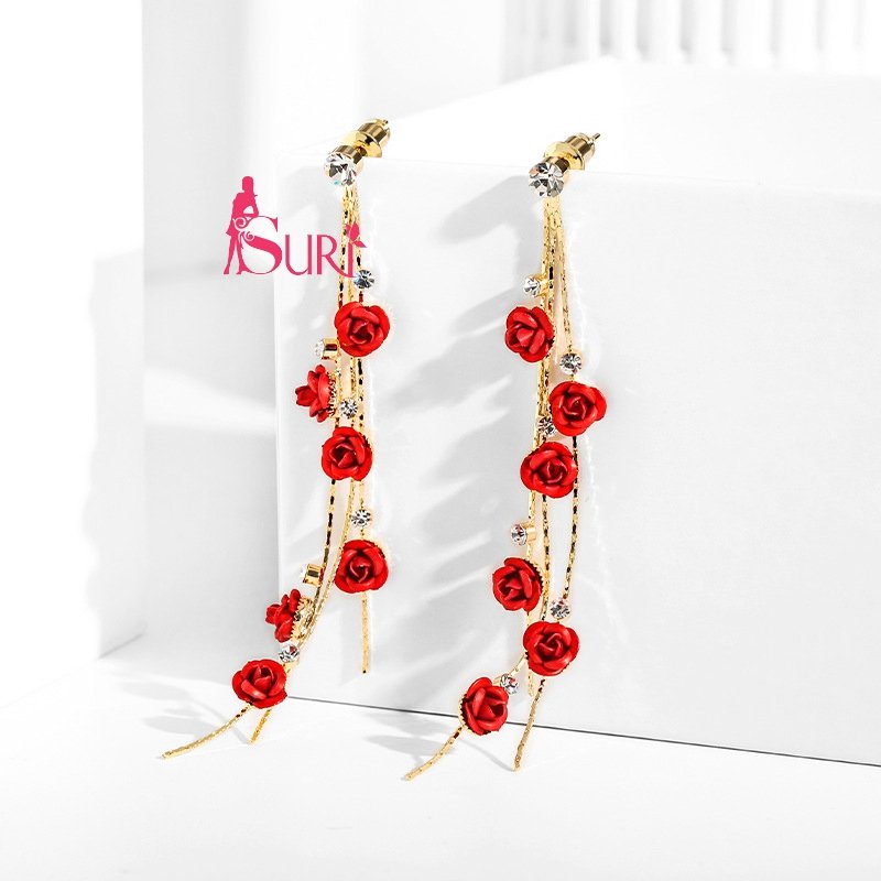 Bông Tai Tòn Teng Hoa Hồng Đỏ Dáng Rơi