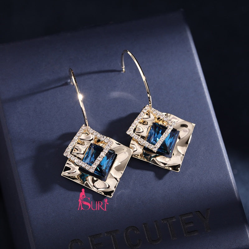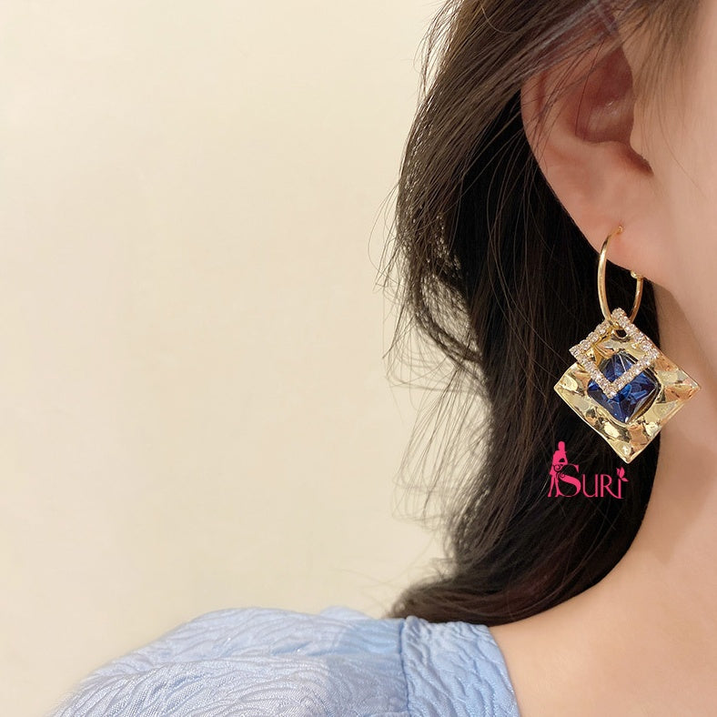 Bông Tai Tòn Teng Khoen Hình Thoi Vàng 3 Lớp Phối Đá Xanh Cá Tính