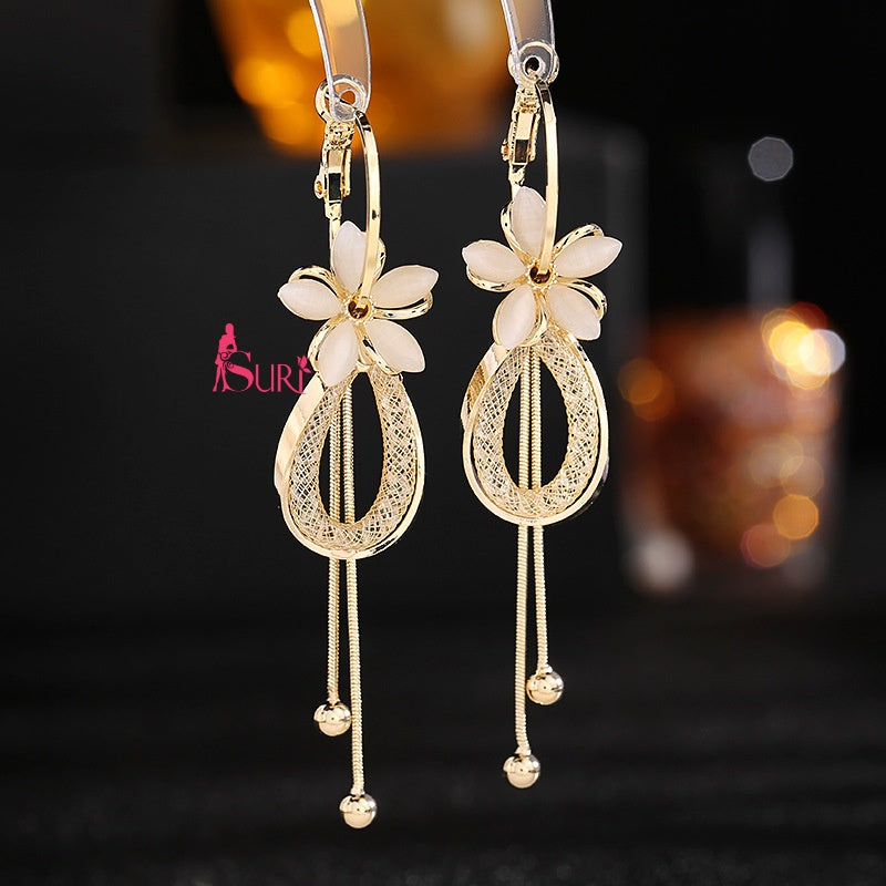 Bông Tai Tòn Teng Khoen Hoa Mắt Mèo Phối Lưới Tua Rua