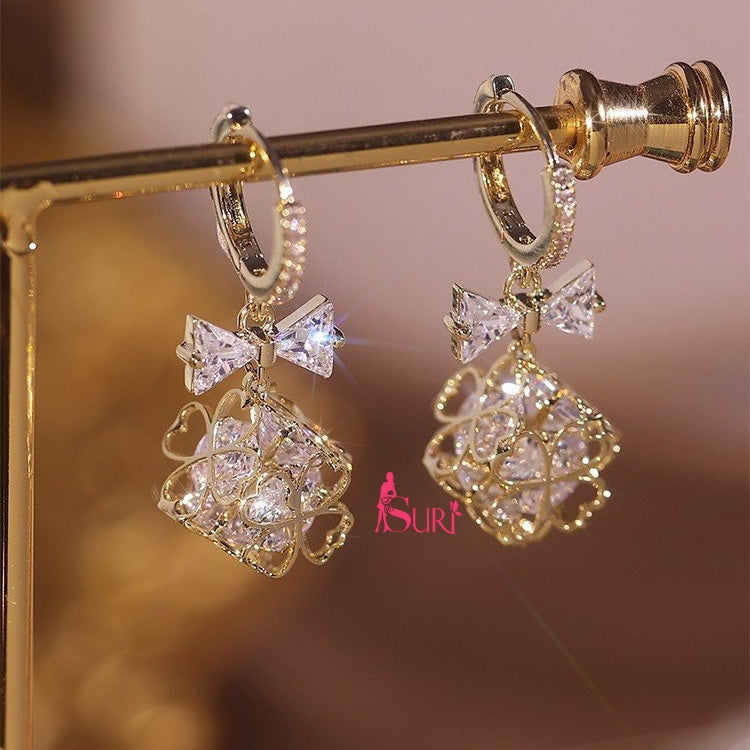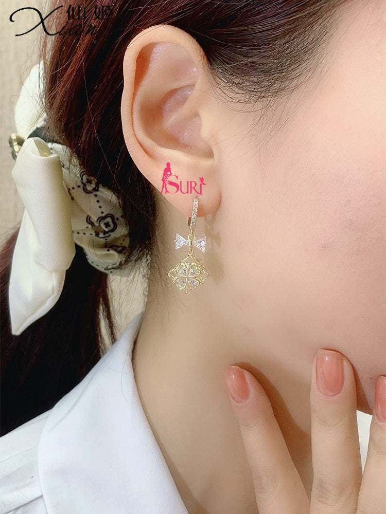 Bông Tai Tòn Teng Khoen Lập Phương Hoa Văn Hoa 4 Cánh Phối Đá Trắng