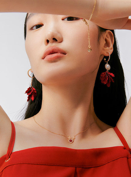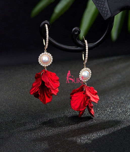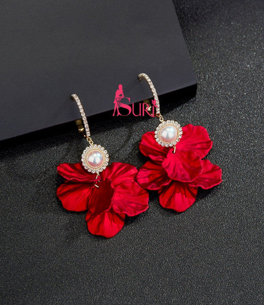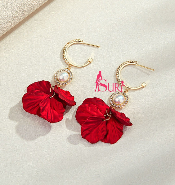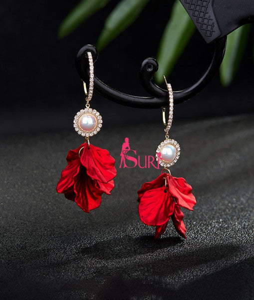 Bông Tai Tòn Teng Khoen Ngọc Trai Cánh Hoa Rơi Màu Đỏ