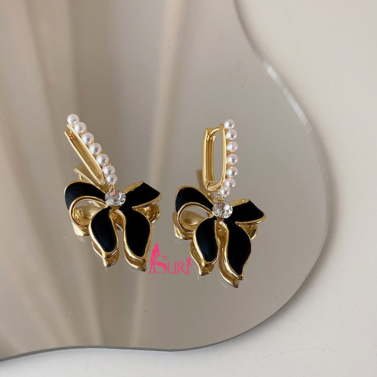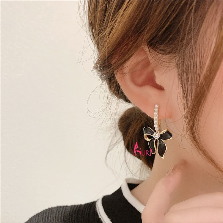 Bông Tai Tòn Teng Khoen Ngọc Trai Phối Nơ Đen Xinh Xắn