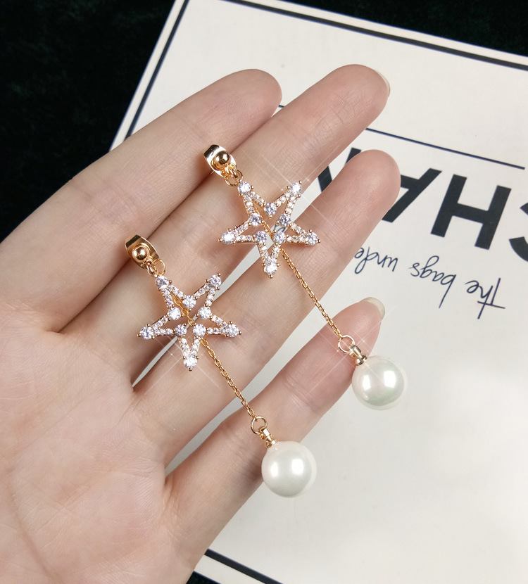 Bông tai tòn teng ngôi sao vàng phối ngọc trai