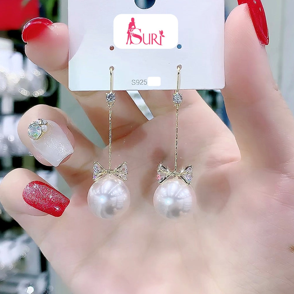 Bông Tai Tòn Teng Nơ Đá Trắng Phối Ngọc Trai Hồng Dạng Móc