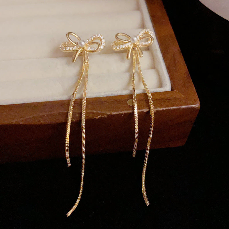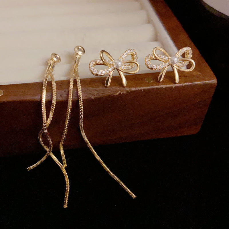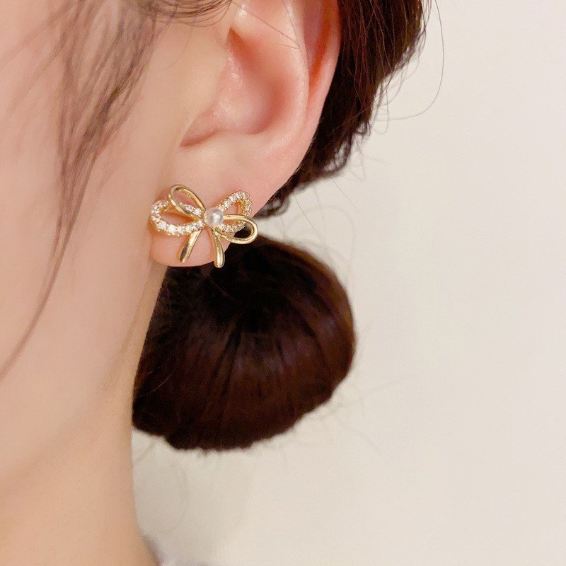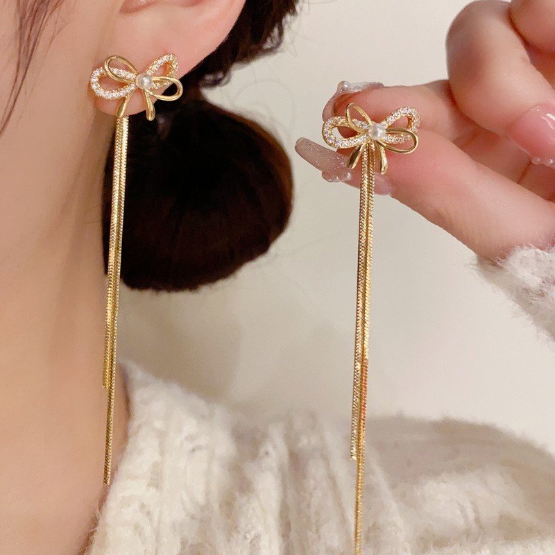 Bông Tai Tòn Teng Nơ Đính Đá Phối Hạt Trai Dáng Dài 2 Kiểu