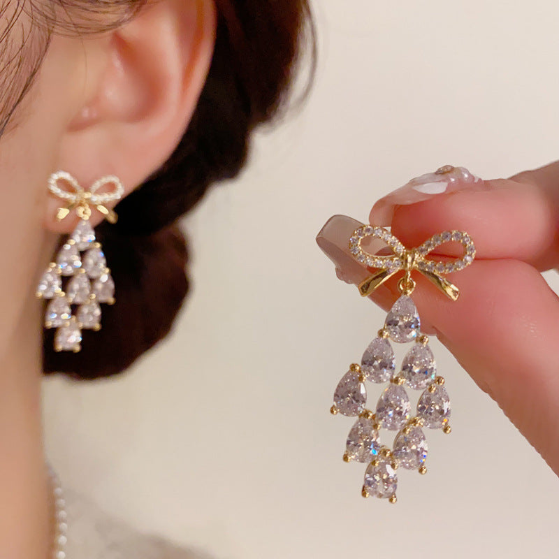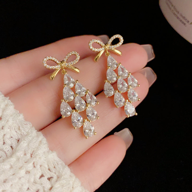 Bông Tai Tòn Teng Nơ Phối Đá Giọt Nước Dáng Rơi