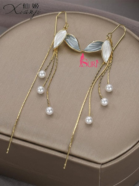 Bông Tai Tòn Teng Phối Lá 2 Màu Tua Rua Ngọc Trai 3 Hạt