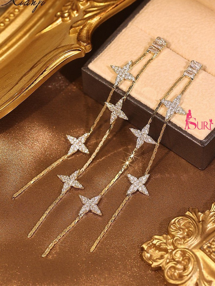 Bông Tai Tòn Teng Sao Băng Đính Đá Trắng Tua Rua Dáng Rơi Lạ Mắt