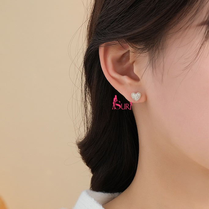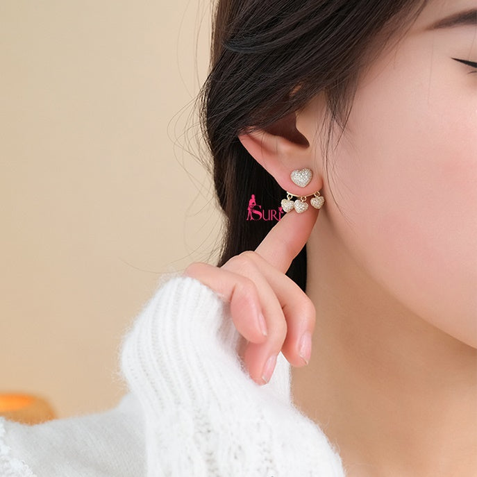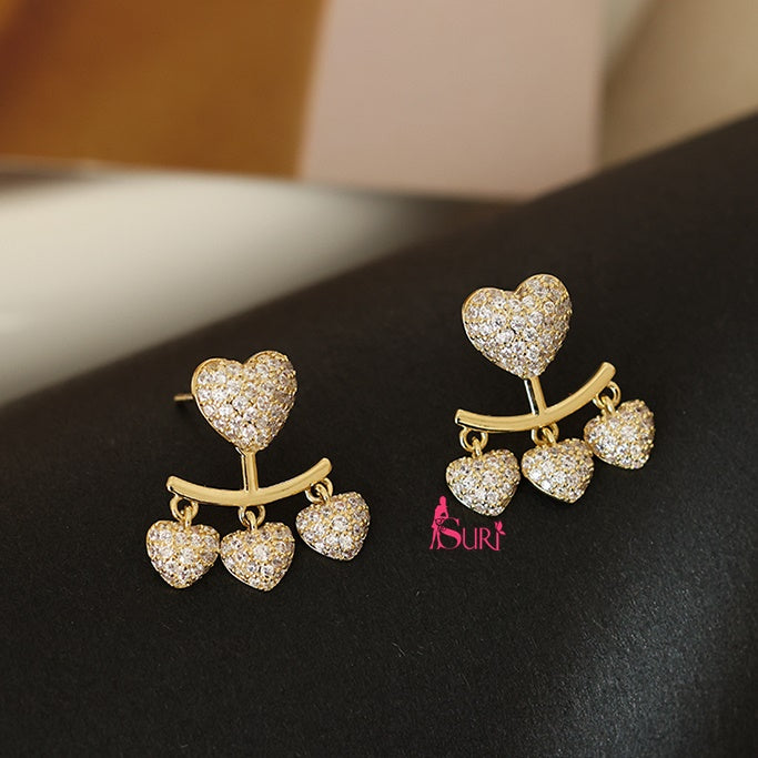 Bông Tai Tòn Teng Trái Tim Vàng Phối Đá Trắng Tua Rua 3 Hạt Cao Cấp