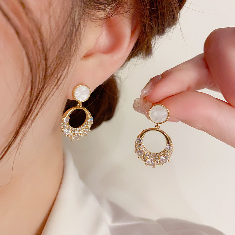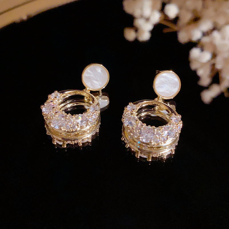 Bông Tai Tòn Teng Tròn Đôi Đính Đá Phối Xà Cừ Trắng Cá Tính