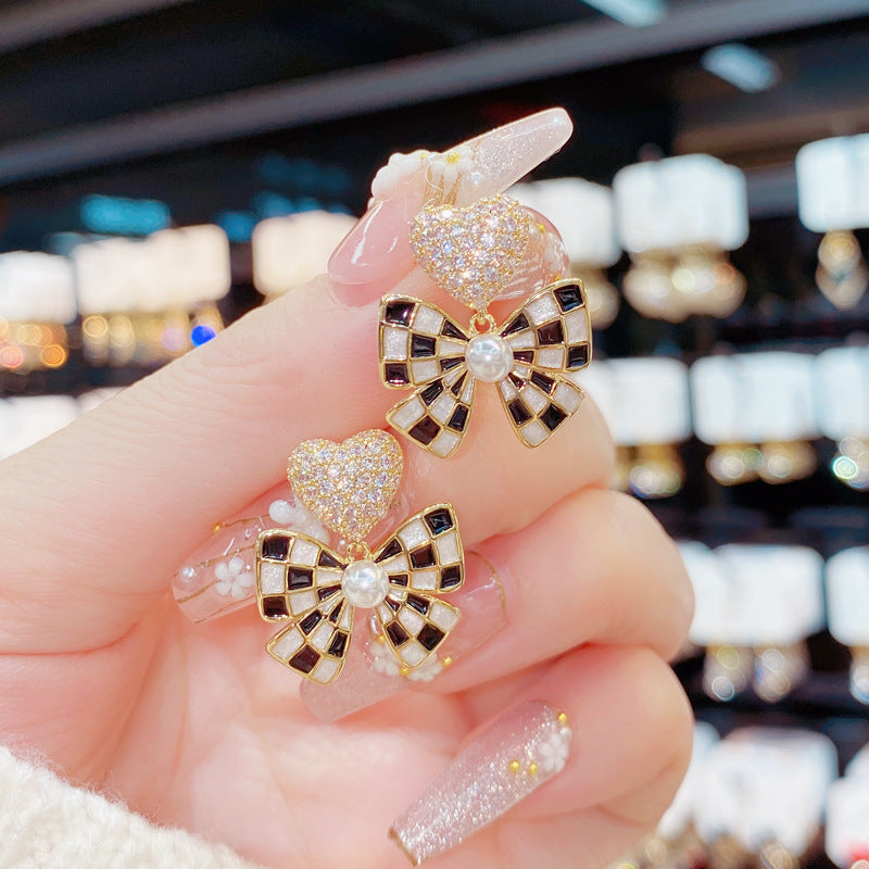 Bông Tai Trái Tim Đá Phối Nơ Caro Đen