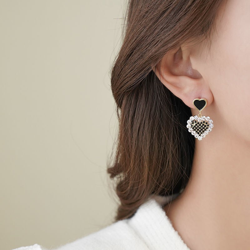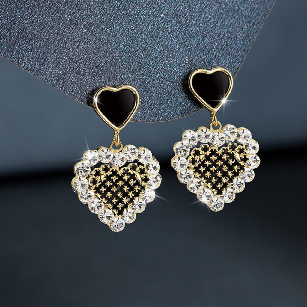 Bông Tai Trái Tim Đôi Đá Đen Viền Đá Trắng
