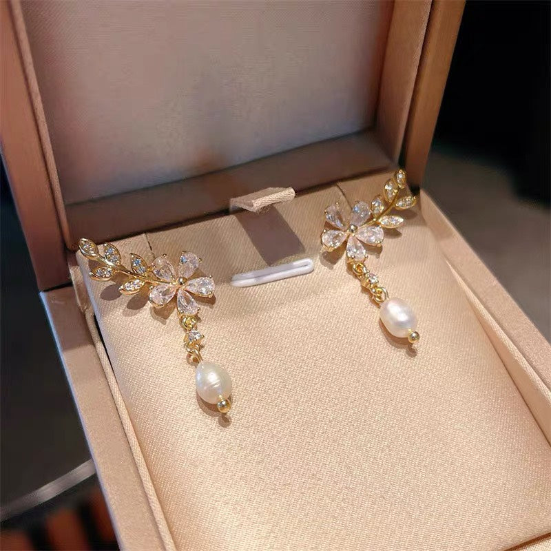 Bông Tai Vành Tai Hoa Đá Phối Lá Ngọc Trai Trắng